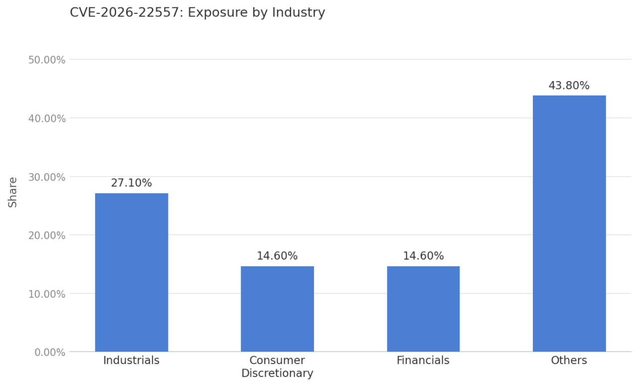 The presence of Financials alongside Industrials reflects how widely UniFi has been adopted beyond traditional small-business use cases. In both sectors, the relevant risk is not limited to directly exposed controllers — internet-facing applications and partner-accessible services backed by UniFi-managed infrastructure extend the effective attack surface considerably.