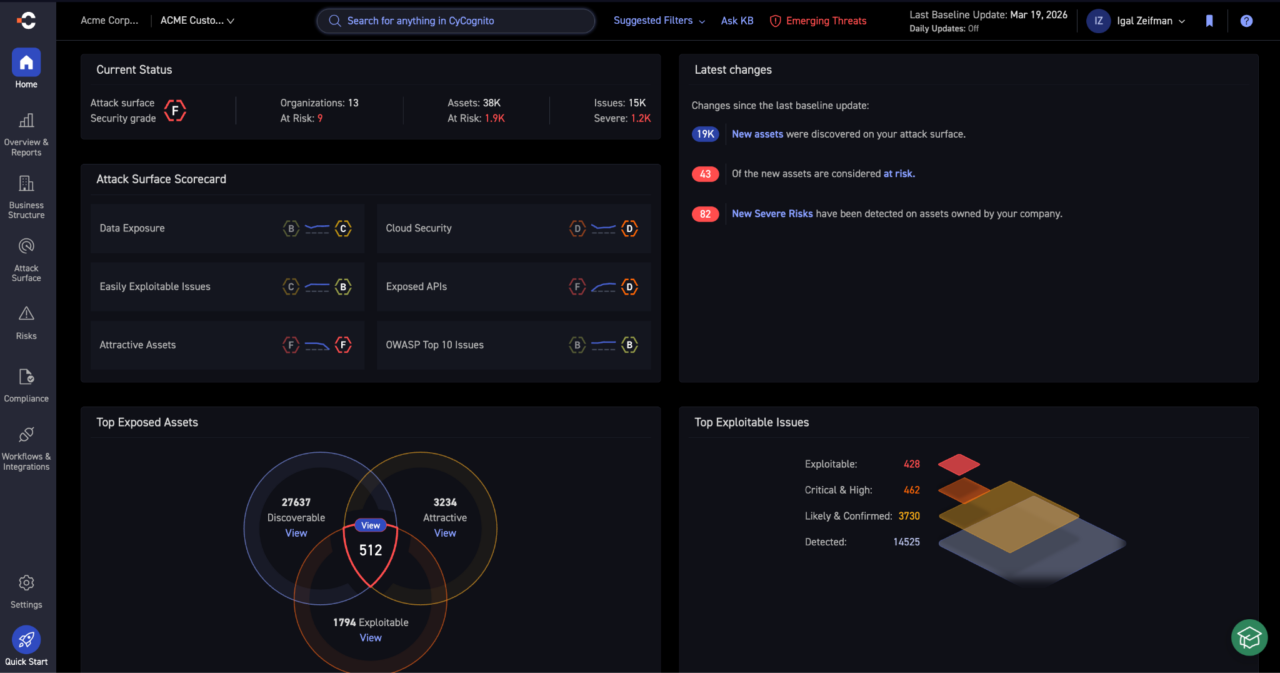 CyCognito is an external exposure management platform that runs every stage of the CTEM cycle — scoping, discovery, prioritization, validation, and mobilization — against the internet-facing attack surface.