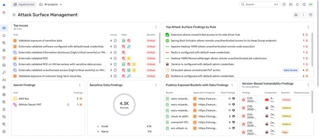 - Exposure mapping: Visualizes vulnerabilities, misconfigurations, and access issues across the attack surface